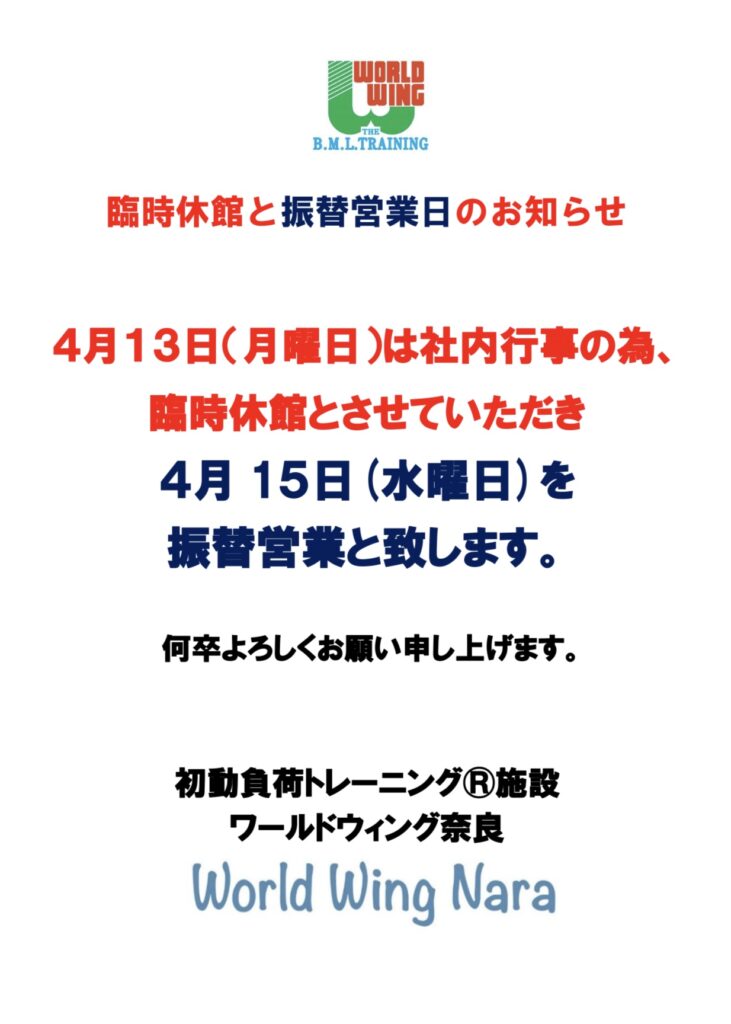 2026/03/23お知らせ 臨時休館と振替営業日のお知らせです。 臨時休館と振替営業日のお知らせです。 4月13日(月曜日)は社内行事の為、臨時休館とさせていただき 4月15日(水曜日)を振替営業と致します。 何卒よろしくお願い申し上げます。
